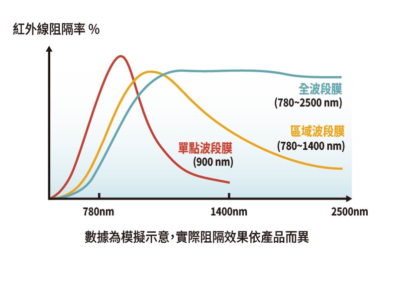 大部分讓人感到悶熱的能量,其實來自近紅外線(IR)波段,尤其是 780nm–2500nm 範圍,而非肉眼看得見的陽光。若只阻擋可見光或單一波段紅外線,實際降溫效果有限。